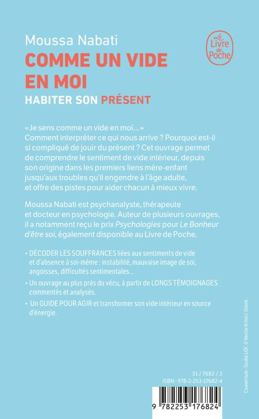 « Comme un vide en moi… » Que cache cette plainte maintes fois entendue? Le psychanalyste Moussa Nabati montre, à travers trois témoignages, que ce mal-être reflète l’absence à soi, pouvant se manifester par l’instabilité, l’hyperactivité, mais aussi par les angoisses, la dépression et les difficultés en amour. Ce trouble provient d’une carence ancienne, due à l’indisponibilité psychologique de la mère. Le sentiment d’abandon crée chez le bébé une dépression précoce, responsable plus tard du vide intérieur empêchant l’adulte d’être présent à soi et aux autres. Ce dernier aura alors tendance à rechercher, à l’excès, amour et reconnaissance afin de combler son vide. Quête qui ne fera qu’exacerber sa dépendance affective. À travers son concept de « compréhension incarnée », l’auteur propose des pistes d’évolution : réhabiliter ses parents intérieurs pour transformer son vide en source d’énergie et « cueillir les roses de la vie ».