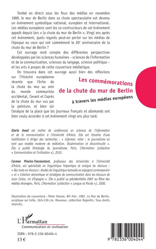 Vingt ans après la chute du mur de Berlin, quels regards peut-on porter sur les médias de l'époque ou ceux qui ont commémoré le 20e anniversaire de cet événement ? On trouvera ici des réflexions sur l'histoire européenne récente, l'écho de la chute du mur au sein du monde communiste occidental, l'avant et l'après de la chute du mur vus par la peinture, et l'analyse de la place que les journaux français et allemands ont bien voulu accorder à cet événement vingt ans plus tard.