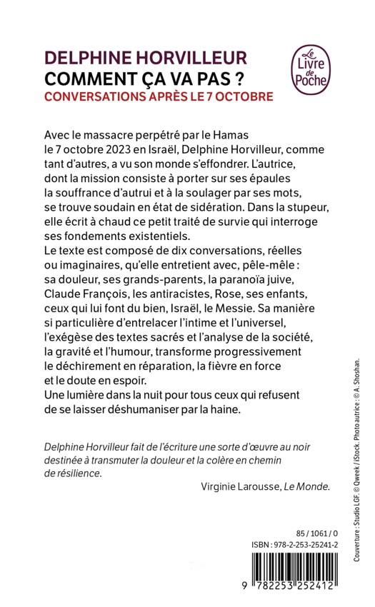 Avec  le massacre perpétré par le Hamas le 7 octobre 2023 en Israël, l’autrice, comme tant d’autres, a vu son monde s’effondrer. Elle, dont la mission consiste à porter sur ses épaules la souffrance d’autrui et à la soulager par ses mots, se trouve soudain en état de sidération. Dans la stupeur, elle écrit à chaud ce petit traité de survie qui interroge ses fondements existentiels. Le texte est composé de dix conversations, réelles ou imaginaires, qu’elle entretient avec, pêle-mêle  : sa douleur, ses grands-parents, la paranoïa juive, Claude François, les antiracistes, Rose, ses enfants, ceux qui lui font du bien, Israël, le Messie. Sa manière si particulière d’entrelacer l’intime et l’universel, l’exégèse des textes sacrés et l’analyse de la société, la gravité et l’humour, transforme progressivement le déchirement en réparation, la fièvre en force et le doute en espoir.