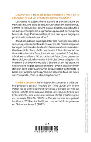 Les Grecs le jugent fixe d'avance et pensent avoir au moins six moyens de le decouvrir. Certains sont bien connus, comme le recours aux devins ou aux oracles, mais d'autres ne manqueront pas de surprendre: qui aurait pense qu'au temps du sage Platon existaient des pratiques magiques proches de celles du vaudou ? Il faut sans doute aussi apporter des nuances aux idees recues, que les recentes decouvertes de l'archeologie et l'analyse precise des textes litteraires amenent a reviser. Quelle etait la place reelle des devins ? Que demandait un Grec a Apollon et a Zeus, lorsqu'il les consultait a Delphes, a Dodone ou ailleurs ? Etait-ce le sort futur d'une guerre ou d'une cite, ou celui d'un olivier ? Enfin, les Grecs croyaient-ils vraiment a un avenir immuable ? En consultant les dieux, ne cherchaient-ils pas tant a connaitre l'avenir qu'a l'orienter dans un sens desire, a trouver ce qui restait au fond de la boite de Pandore apres qu'elle eut deverse tous les maux sur l'humanite, c'est-a-dire l'esperance ?