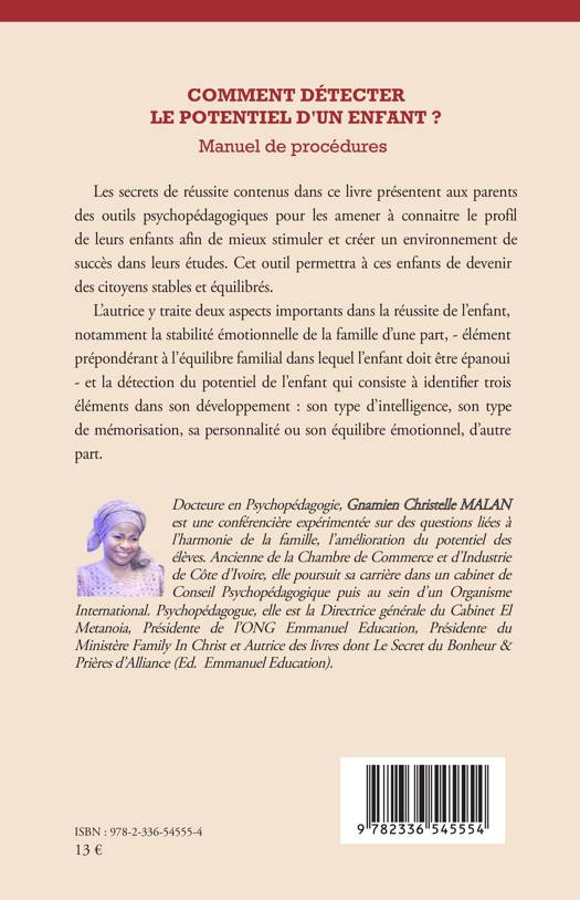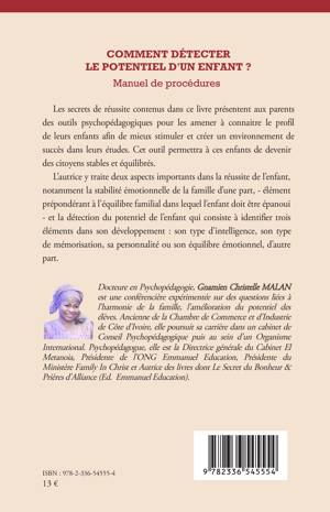 Les secrets de réussite contenus dans ce livre présentent aux parents des outils psychopédagogiques pour les amener à connaitre le profil de leurs enfants afin de mieux stimuler et créer un environnement de succès dans leurs études. Cet outil permettra à ces enfants de devenir des citoyens stables et équilibrés. L'autrice y traite deux aspects importants dans la réussite de l'enfant, notamment la stabilité émotionnelle de la famille d'une part, - élément prépondérant à l'équilibre familial dans lequel l'enfant doit être épanoui - et la détection du potentiel de l'enfant qui consiste à identifier trois éléments dans son développement: son type d'intelligence, son type de mémorisation, sa personnalité ou son équilibre émotionnel, d'autre part.