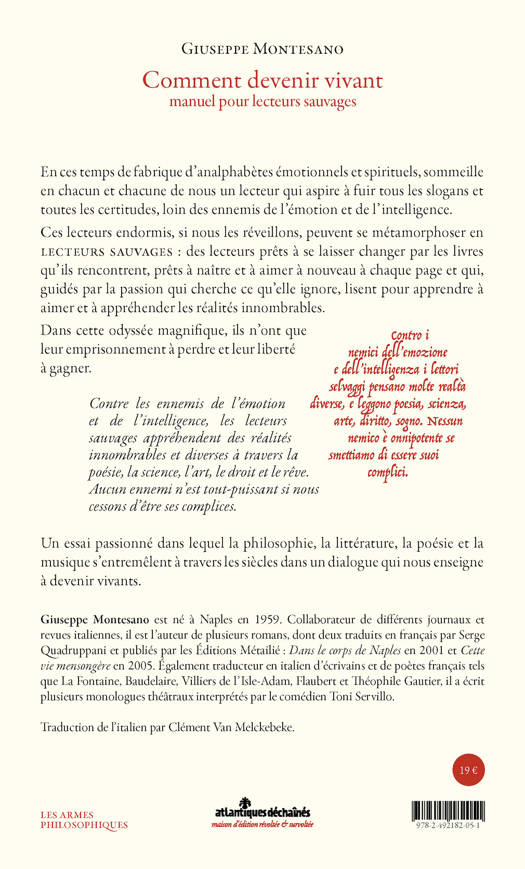 Giuseppe Montesano distille un essai passionné qui fait écho à son chef d’oeuvre de 1 920 pages Lettori selvaggi paru en 2016 chez Giunti. Il y déploie une vision entière de l’Homme et du savoir qui dessine un humanisme contemporain. L’auteur s’adresse à chaque lecteur qui sommeille en nous : à ceux qui fuient tous les slogans et toutes les certitudes, à ceux qui n’ont pas peur de leur ignorance parce qu’ils savent en faire une soif de connaissance. Son argumentation érudite vise à nous rappelle qu’ouvrir un livre c’est entrer dans le royaume de la liberté. Le lecteur prêt à se laisser changer par les livres qu’il rencontre, prêt à naître et à aimer à nouveau à chaque page, est un lecteur sauvage : dans l’aventure il n’a que son emprisonnement à perdre, et toute sa vie à gagner.