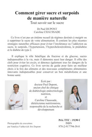 Ce livre n’est pas un énième recueil de régimes destinés à maigrir ou à supprimer le sucre de votre alimentation. Il regroupe les plus récentes stratégies naturelles qui se sont avérées efficaces pour éviter l’intolérance ou l’addiction au sucre, le surpoids, l’hypertension, le cholestérol, le prédiabète et le diabète de type 2. Il explique le rôle bénéfique du fructose et du glucose, sucres indispensables à la vie, mais il démontre aussi leur danger. Il offre également des clefs pour éviter les excès, autant que les dangers de la restriction cognitive. Ce livre servira de guide pour faire un meilleur choix à la fois des aliments et des nouveaux compléments alimentaires innovants indispensables pour conserver un bon métabolisme et une bonne santé.