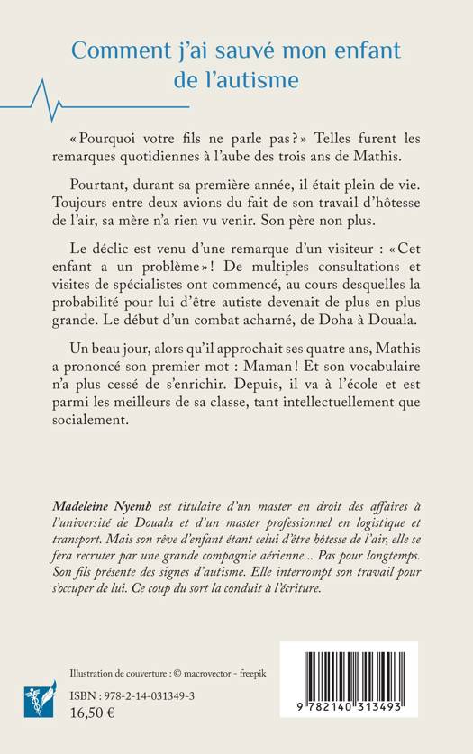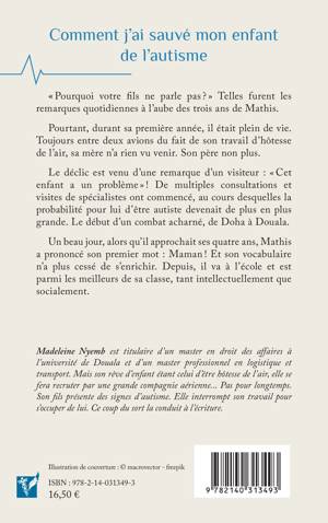 Comment j'ai sauvé mon enfant de l'autisme Pourquoi votre fils ne parle pas ? Telles furent les remarques quotidiennes à l'aube des trois ans de Mathis. Pourtant, durant sa première année, il était plein de vie. Toujours entre deux avions du fait de son travail d'hôtesse de l'air, sa mère n'a rien vu venir. Son père non plus. Le déclic est venu d'une remarque d'un visiteur: Cet enfant a un problème ! De multiples consultations et visites de spécialistes ont commencé, au cours desquelles la probabilité pour lui d'être autiste devenait de plus en plus grande. Le début d'un combat acharné, de Doha à Douala. Un beau jour, alors qu'il approchait ses quatre ans, Mathis a prononcé son premier mot: Maman ! Et son vocabulaire n'a plus cessé de s'enrichir. Depuis, il va à l'école et est parmi les meilleurs de sa classe, tant intellectuellement que socialement.