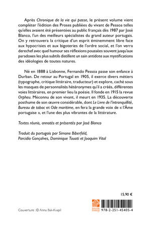 Apres Chronique de la vie qui passe, le present volume vient completer l'edition des Proses publiees du vivant de Pessoa telles qu'elles avaient ete presentees au public francais des 1987 par Jose Blanco, l'un des meilleurs specialistes du grand auteur portugais. On y retrouvera la critique d'un esprit eminemment libre face aux hypocrisies et aux bigoteries de l'ordre social, et l'on verra derechef avec quel humour ses reflexions poussees souvent jusqu'aux paradoxes les plus subtils distillent un sain antidote aux mystifications des ideologies de toutes natures.