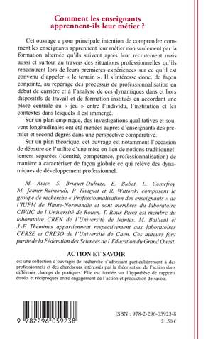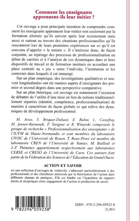Cet ouvrage a pour principale intention de comprendre comment les enseignants apprennent leur métier non seulement par la formation alternée qu'ils suivent après leur recrutement mais aussi et surtout au travers des situations professionnelles qu'ils rencontrent lors de leurs premières expériences sur ce qu'il est convenu d'appeler "le terrain". Il s'intéresse au repérage des processus de professionnalisation en début de carrière.