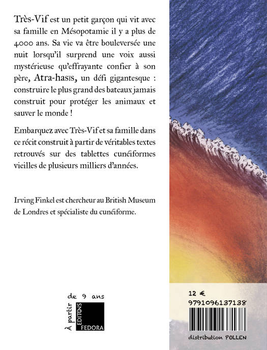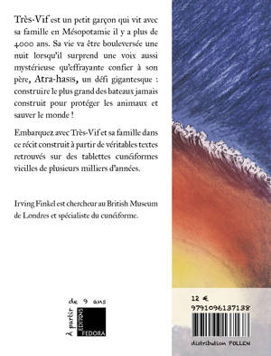 Il y a quatre mille ans, bien avant que l'histoire de l'Arche de Noé ne soit écrite dans la Bible hébraïque, les Sumériens et les Babyloniens de l'ancienne Mésopotamie connaissaient déjà l'histoire du déluge et du fameux bateau qui a sauvé tous les animaux. Le héros babylonien de cette histoire, Atra-hasÄ«s, a été - tout comme Noé - chargé par ses dieux de construire un navire pour assurer la sécurité de sa famille et de tous les animaux jusqu'à la fin du déluge. À travers les yeux de son plus jeune fils, Très-Vif, suivez cette aventure et plongez dans l'Histoire et les mythes de l'antique Mésopotamie. I. Finkel, spécialiste du cunéiforme au British Museum base son histoire sur de véritables tablettes cunéiformes pour nous livrer ce recit d'apocalypse et de survie qui a su traverser le temps. Cet ouvrage enrichi de nombreuses illustrations en couleurs ravira petits et grands