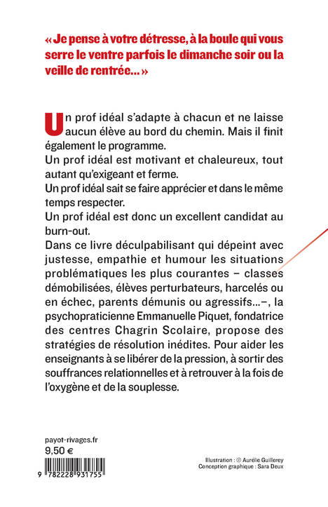 Un prof idéal s'adapte à chacun et ne laisse aucun élève au bord du chemin. Mais il finit également le programme. Un prof idéal est motivant et chaleureux, tout autant qu'exigeant et ferme. Un prof idéal sait se faire apprécier et dans le même temps respecter. Un prof idéal est donc un excellent candidat au burn-out. Dans ce livre déculpabilisant qui dépeint avec justesse, empathie et humour les situations problématiques les plus courantes - classes démobilisées, élèves perturbateurs, harcelés ou en échec, parents démunis ou agressifs -, la psychopraticienne Emmanuelle Piquet, fondatrice des centres Chagrin Scolaire, propose des stratégies de résolution inédites. Pour aider les enseignants à se libérer de la pression, à sortir des souffrances relationnelles et à retrouver à la fois de l'oxygène et de la souplesse