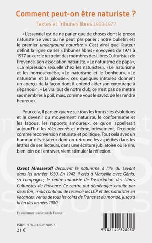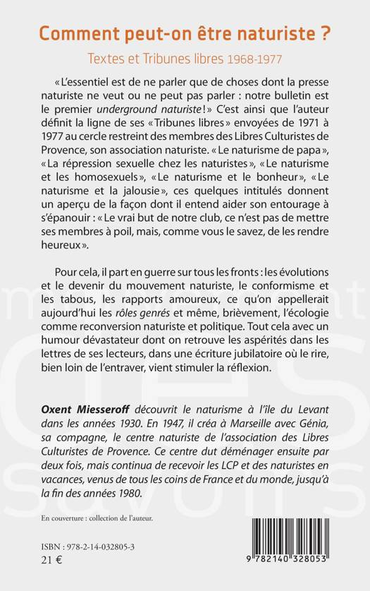 L'essentiel est de ne parler que de choses dont la presse naturiste ne veut ou ne peut pas parler: notre bulletin est le premier underground naturiste ! C'est ainsi que l'auteur définit la ligne de ses Tribunes libres envoyées de 1971 à 1977 au cercle restreint des membres des Libres Culturistes de Provence, son association naturiste. Le naturisme de papa, La répression sexuelle chez les naturistes, Le naturisme et les homosexuels, Le naturisme et le bonheur, Le naturisme et la jalousie, ces quelques intitulés donnent un aperçu de la façon dont il entend aider son entourage à s'épanouir: Le vrai but de notre club, ce n'est pas de mettre ses membres à poil, mais, comme vous le savez, de les rendre heureux . Pour cela, il part en guerre sur tous les fronts: les évolutions et le devenir du mouvement naturiste, le conformisme et les tabous, les rapports amoureux, ce qu'on appellerait aujourd'hui les rôles genrés et même, brièvement, l'écologie comme reconversion naturiste et politique. Tout cela avec un humour dévastateur dont on retrouve les aspérités dans les lettres de ses lecteurs, dans une écriture jubilatoire où le rire, bien loin de l'entraver, vient stimuler la réflexion.