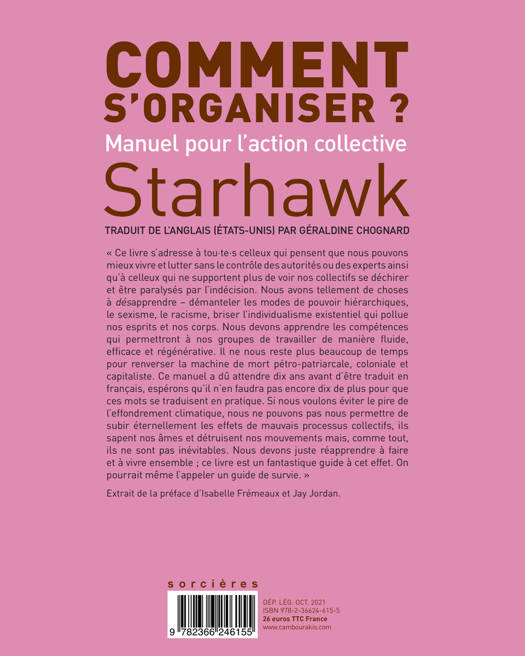 « Ce livre s'adresse à tou·te·s celleux qui pensent que nous pouvons mieux vivre et lutter sans le contrôle des autorités ou des experts ainsi qu'à celleux qui ne supportent plus de voir nos collectifs se déchirer et être paralysés par l'indécision. Nous avons tellement de choses à désapprendre - démanteler les modes de pouvoir hiérarchiques, le sexisme, le racisme, briser l'individualisme existentiel qui pollue nos esprits et nos corps. Nous devons apprendre les compétences qui permettront à nos groupes de travailler de manière fluide, efficace et régénérative. Il ne nous reste plus beaucoup de temps pour renverser la machine de mort pétro- patriarcale, coloniale et capitaliste. Ce manuel a dû attendre dix ans avant d'être traduit en français, espérons qu'il n'en faudra pas encore dix de plus pour que ces mots se traduisent en pratique. Si nous voulons éviter le pire de l'effondrement climatique, nous ne pouvons pas nous permettre de subir éternellement les effets de mauvais processus collectifs, ils sapent nos âmes et détruisent nos mouvements mais, comme tout, ils ne sont pas inévitables. Nous devons juste réapprendre à faire et à vivre ensemble ; ce livre est un fantastique guide à cet effet. On pourrait même l'appeler un guide de survie. » Extrait de la préface d'Isabelle Frémeaux et Jay Jordan.