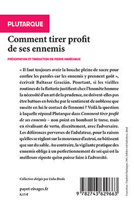 « Il faut toujours avoir la bouche pleine de sucre pour confire les paroles car les ennemis y prennent goût », écrivait Baltasar Gracián. Pourtant, si les vieilles routines de la flatterie justifient chez l'honnête homme la nécessité d'un art de la prudence, ne doivent-elles pas être battues en brèche par le sentiment de noblesse que suscite en lui le contact de l'ennemi ? Voilà la question à laquelle répond Plutarque dans «Comment tirer profit de ses ennemis» - non point en bombant le torse, mais en rivalisant de vertu, discrètement, avec l'adversaire. Les déférences perverses de l'adulateur, pour la raison qu'elles se règlent sur la mouvance d'autrui, ne bâtissent que sur du sable. Au contraire, la vigilante pratique des ennemis oblige à un perfectionnement de soi qui est la meilleure riposte qu'on puisse faire à l'adversité.