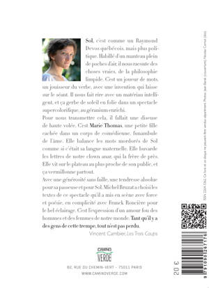 Sol, c’est comme un Raymond Devos québécois, mais plus politique. Il nous raconte des choses vraies. C’est un joueur de mots avec une invention qui laisse sur le séant. Il nous fait rire avec un matériau intelligent. Pour nous transmettre cela, il fallait une diseuse de haute volée. C’est Marie Thomas, funambule de l’âme qui balance les mots mordorés de Sol comme si c’était sa langue maternelle. Elle vit sur le plateau au plus proche de son public, et ça vermillonne partout. Avec une générosité sans faille, une tendresse absolue pour sa passeuse et pour Sol, Michel Bruzat a choisi les textes de ce spectacle qu’il a mis en scène avec force et poésie, en complicité avec Franck Roncière pour l’éclairage. C’est l’expression d’un amour fou des hommes et des femmes de notre monde. Tant qu’il y a des gens de cette trempe, tout n’est pas perdu. Vincent Cambier, Les Trois Coups