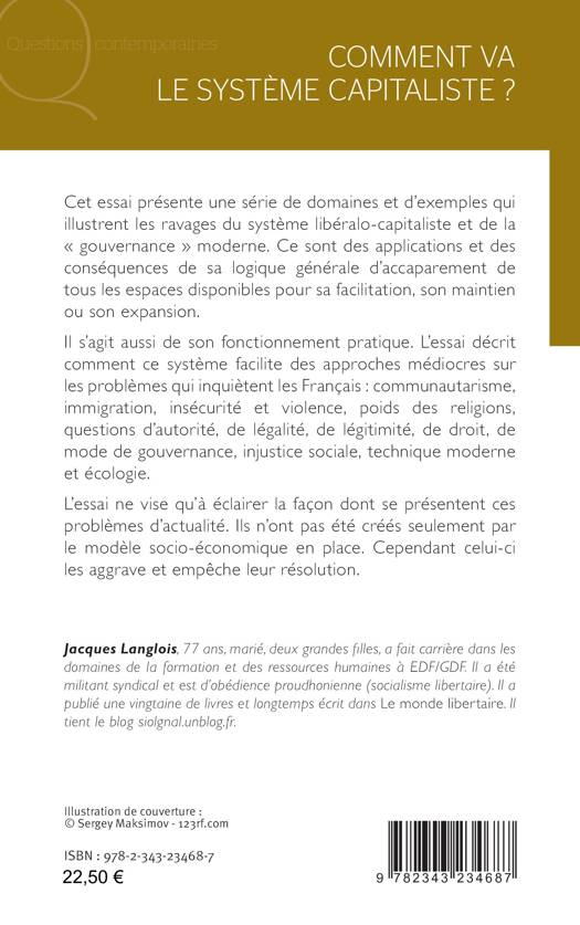 Cet ouvrage présente une série de domaines et d’exemples qui illustrent les ravages du système libéralo-capitaliste et de la « gouvernance » moderne. Ce sont des applications et des conséquences de sa logique générale d’accaparement de tous les espaces disponibles pour sa facilitation, son maintien ou son expansion. Il s’agit aussi de son fonctionnement pratique. L’auteur décrit comment ce système facilite des approches médiocres sur les problèmes qui inquiètent les Français : communautarisme, immigration, insécurité et violence, poids des religions, questions d’autorité, de légalité, de légitimité, de droit, de mode de gouvernance, injustice sociale, technique moderne et écologie. Cette réflexion ne vise qu’à éclairer la façon dont se présentent ces problèmes d’actualité. Ils n’ont pas été créés seulement par le modèle socio-économique en place. Cependant celui-ci les aggrave et empêche leur résolution.