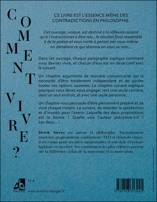 Cet ouvrage, unique, est destiné à la réflexion autant qu’à l’instruction et à être relu ; le résultat final ressemble à de la poésie et vous invite à penser par vous-même en démêlant ce qui résonne en vous ou non… Dans cet ouvrage, chaque paragraphe explique comment vous devriez vivre, et chacun d’eux est en désaccord avec le suivant. Un chapitre argumente de manière convaincante sur la nécessité d’être totalement indépendant et de garder toutes vos options ouvertes. Le chapitre suivant explique pourquoi vous devez vous engager vers une seule carrière, dans un seul endroit, et avec une seule personne… Un chapitre vous persuade d’être pleinement présent et de vivre chaque instant. Le suivant, de retarder la satisfaction et d’investir pour l’avenir. Laquelle des deux propositions est la bonne ? Quelle voie l’auteur préconise-t-il ? Les deux… !