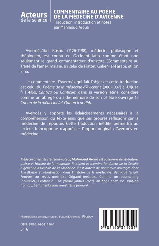 Averroès/Ibn Rushd (1126-1198), médecin, philosophe et théologien, est connu en Occident latin comme étant non seulement le grand commentateur d'Aristote (Commentaire au Traité de l'âme), mais aussi celui de Platon, Galien, al-Farabi, et Ibn Sina. Le commentaire d'Averroès qui fait l'objet de cette traduction est celui du Poème de la médecine d'Avicenne (980-1037) al-Urjuza fi al-tibb, Cantica ou Canticum dans sa version latine, considéré comme un abrégé ou aide-mémoire de son célèbre ouvrage Le Canon de la médecine/al-Qanun fi al-tibb. Averroès y apporte les éclaircissements nécessaires à la compréhension du texte ainsi que ses propres réflexions sur la médecine de l'époque. Cette traduction inédite permettra au lecteur francophone d'apprécier l'apport original d'Averroès en médecine.