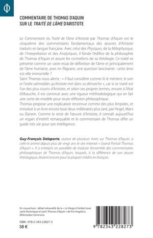Le Commentaire du Traité de l’âme d’Aristote par Thomas d’Aquin est le cinquième des commentaires fondamentaux des oeuvres d’Aristote traduits en langue française. Avec celui des Physiques, de la Métaphysique, de l’Interprétation et des Analytiques, il fonde l’édifice de la philosophie de Thomas d’Aquin et assure les contreforts de sa théologie. Ce traité se présente comme un vaste essai de définition de l’âme et principalement de l’âme humaine, avec en filigrane, une question lancinante : cette âme est-elle immortelle ? Si ce traité est l’un des plus courts d’Aristote, et selon ses propres termes, encore à l’état d’ébauche, il est construit avec une rigueur méthodologique qui en fait une sorte de modèle pour toute réflexion philosophique. Thomas propose une explication reconnue comme des plus limpides, et introduit à un livre encore loué deux millénaires plus tard par Hegel, Marx ou Darwin. Comme le reste de l’oeuvre d’Aristote, il connaît aujourd’hui un regain d’intérêt remarquable et le commentaire de Thomas offre un guide très sûr pour son intelligence.