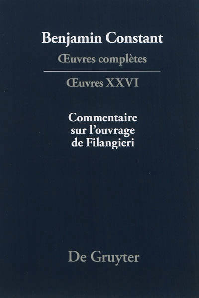 Ce tome XXVI, consacré au dernier grand texte de théorie politique publié du vivant de Constant, le Commentaire sur l'ouvrage de Filangieri (1822-1824), offre le texte critique de l'édition originale, avec les variantes du manuscrit reconstitué partiellement, des commentaires qui se proposent de présenter le contexte de l'ouvrage, et une série de documents complémentaires qui s'échelonnent entre 1800 (moment où Constant a lu pour la première fois le texte de Filangieri) et 1826 (l'année de la mise à l'index de son Commentaire par l'Inquisition romaine). Le Commentaire complète les Principes de politique de 1815 et les ouvrages ou brochures politiques que l'auteur a réunis dans son Cours de politique constitutionnelle dont le dernier volume a paru en 1820. Les uvres complètes offrent donc, avec ce tome XXVI, la série complète de ces textes qui constituent une philosophie politique toujours d'actualité.