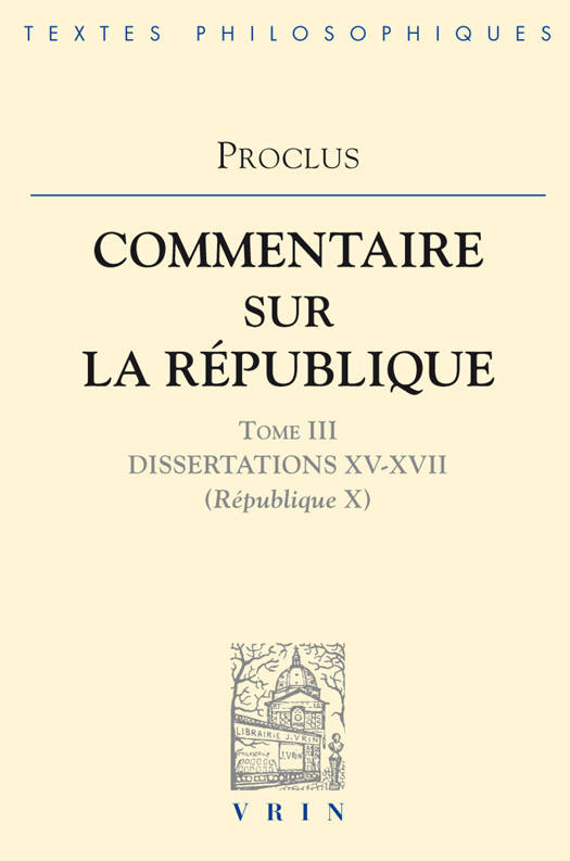 Le Commentaire de Proclus sur la Republique de Platon ne suit pas le texte platonicien phrase a phrase, comme les Commentaires sur l'Alcibiade ou sur le Timee, mais il offre une succession de dix-sept dissertations dans l'ordre des livrees de la Republique. Deux d'entres elles sont tres etendues: la sixieme qui est une defense d'Homere contre Platon et la seizieme sur le mythe d'Er, qui est adressee a Marinus, le disciple de Proclus, auteur de la Vita Procli. Cette derniere dissertation, de l'aveu meme de son auteur, rapporte et discute plusieurs fois les opinions de Porphyre. Proclus y a retenu et traite en detail deux sujets: l'entree de l'ame dans le corps et le crime horrible de manger ses propres enfants. La dix-septieme dissertation sur les critiques d'Aristote contre la Republique dans le deuxieme livre du Politique, est incomplete. Le traducteur a propose une division du texte et a donne d'abondantes notes qui forment une sorte de commentaire perpetuel.