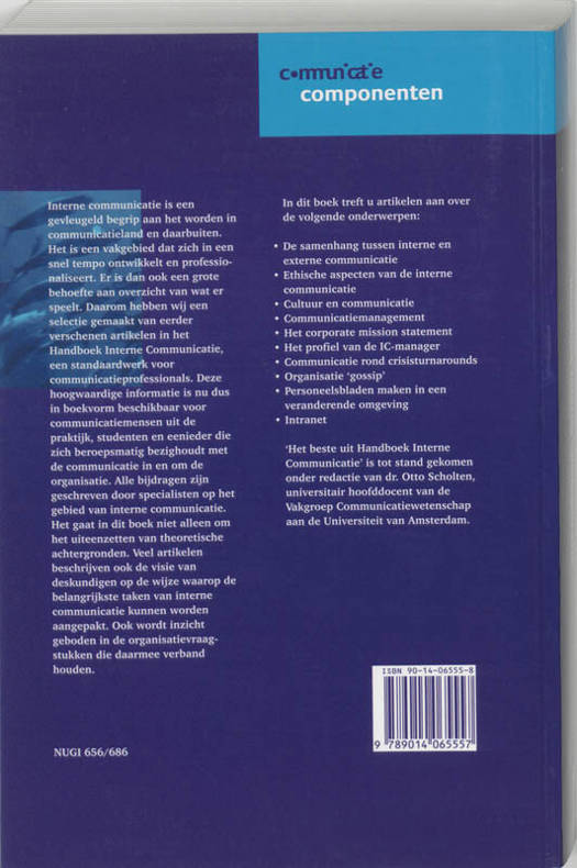 Het belang van goede interne communicatie wordt binnen organisaties steeds duidelijker. Maar in de praktijk leven er nog veel vragen over hoe interne communicatie moet worden opgezet, of hoe die kan worden verbeterd. Reden om 'het beste' uit het Handboek Interne Communicatie uit te brengen in boekvorm. Bij het samenstellen is vooral gekozen voor artikelen waarin ofwel theoretische bouwstenen voor het vakgebied zijn te vinden ofwel visies van deskundigen uit de praktijk op de aanpak van de belangrijkste taken op het gebied van interne communicatie. Alle bijdragen zijn geschreven door specialisten op het gebied van interne communicatie. De combinatie van theorie, organisatie- en managementvraagstukken en de communicatiediscipline zelf maakt het boek niet alleen waardevol voor communicatieprofessionals uit de praktijk, maar ook voor studenten en eenieder die zich beroepsmatig bezighoudt met communicatie in en om de organisatie.