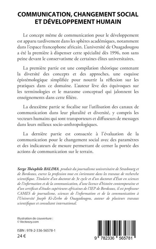 Le concept même de communication pour le développement est apparu tardivement dans les sphères académiques, notamment dans l'espace francophone africain. L'université de Ouagadougou a été la première à dispenser cette spécialité dès 1996, non sans peine devant le conservatisme de certaines élites universitaires. La première partie est une compilation théorique contenant la diversité des concepts et des approches, une esquisse épistémologique simplifiée pour nourrir la réflexion sur les pratiques dans ce domaine. L'auteur lève des équivoques sur les terminologies et le marasme conceptuel qui jalonnent les enseignements dans cette filière. La deuxième partie se focalise sur l'utilisation des canaux de communication dans leur pluralité et diversité, y compris les vecteurs humains qui sont transporteurs et diffuseurs de messages dans leurs milieux socio-anthropologiques. La dernière partie est consacrée à l'évaluation de la communication pour le changement social avec des paramètres et des indicateurs de mesure permettant de cerner la portée des actions de communication sur le terrain.