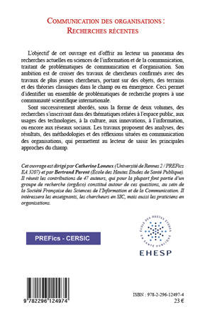 L'objectif de cet ouvrage en deux volumes est d'offrir au lecteur un panorama des recherches actuelles en sciences de l'information et de la communication, traitant de problématiques de communication et d'organisation. Ces recherches s'inscrivent dans des thématiques reliées à l'espace public, aux usages des technologies, à la culture, aux innovations, à l'information ou encore aux réseaux sociaux.