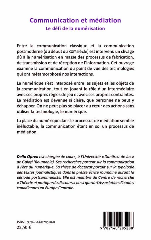 Entre la communication classique et la communication postmoderne (du début du XXIe siècle) est intervenu un clivage dû à la numérisation en masse des processus de fabrication, de transmission et de réception de l'information. Cet ouvrage examine la communication du point de vue des technologies qui ont métamorphosé nos interactions. Le numérique s'est interposé entre les sujets et les objets de la communication, tout en jouant le rôle d'un intermédiaire avec ses propres règles de jeu et avec ses propres contraintes. La médiation est devenue si claire, que personne ne peut y échapper. On ne peut plus se placer au coeur des actions sans utiliser la technologie, le numérique. La place du numérique dans le processus de médiation semble inéluctable, la communication étant en soi un processus de médiation.