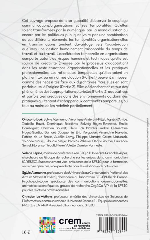 Cet ouvrage propose dans sa globalité d'observer le couplage communications/organisations et ses temporalités. Qu'elles soient transformées par le numérique, par la mondialisation ou encore par les politiques publiques voire par une combinaison de ces différents éléments, les temporalités organisationnelles en transformations tendent davantage vers l'accélération que vers une gestion humainement raisonnable du temps de travail et au travail.