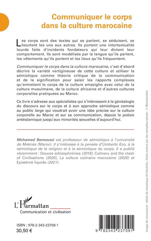 Les corps sont des textes qui se parlent, se séduisent, se heurtent les uns aux autres. Ils portent une intertextualité lourde faite d'incidents fondateurs qui leur dictent leur comportement. Ils sont modélisés par la langue qu'ils parlent, les vêtements qu'ils portent et les lieux qu'ils fréquentent. Ce livre s'adresse aux spécialistes qui s'intéressent à la généalogie du discours sur le corps et à son approche sémiotique, comme au public large qui voudrait avoir une idée précise sur la culture corporelle au Maroc et sur sa communication, depuis la poésie antéislamique jusqu'aux minorités sexuelles d'aujourd'hui.