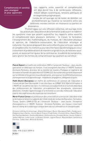 Les rapports entre savoir(s) et compétence(s) ont déjà donné lieu à de nombreuses réflexions, mêlant débats scientifiques, tensions politiques et arrangements pragmatiques. L'enjeu de cet ouvrage est de tenter de démêler cet enchevêtrement qui traverse la rencontre entre ces différents mondes entrant en résonance ou parfois en dissonance. Prenant appui sur une réflexion collective, cet ouvrage invite les acteurs de l'éducation et de la formation à découvrir et redéfinir les questions vives que posent aujourd'hui les rapports entre savoir(s) et compétence(s) dans plusieurs domaines.