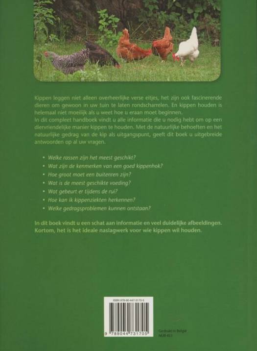 Kippen leggen niet alleen overheerlijke verse eitjes, het zijn ook fascinerende dieren om gewoon in uw tuin te laten rondscharrelen. En kippen houden is helemaal niet moeilijk als u weet hoe u eraan moet beginnen. In dit compleet handboek vindt u alle informatie die u nodig hebt om op een diervriendelijke manier kippen te houden. Met de natuurlijke behoeften en het natuurlijke gedrag van de kip als uitgangspunt, geeft dit boek u uitgebreide antwoorden op al uw vragen. Welke rassen zijn het meest geschikt? Wat zijn de kenmerken van een goed kippenhok? Hoe groot moet een buitenren zijn? Wat is de meest geschikte voeding? Wat gebeurt er tijdens de rui? Hoe kan ik kippenziekten herkennen? Welke gedragsproblemen kunnen ontstaan? In dit boek vindt u een schat aan informatie en veel duidelijke afbeeldingen. Kortom, het ideale naslagwerk voor wie kippen wil houden.