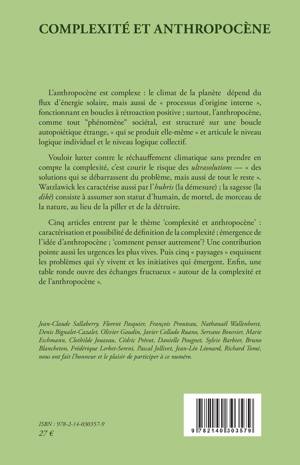 L'anthropocène est complexe : le climat de la planète dépend duflux d'énergie solaire, mais aussi de « processus d'origine interne », fonctionnant en boucles à rétroaction positive ; surtout, l'anthropocène, comme tout "phénomène" sociétal, est structuré sur une boucle autopoiétique étrange, « qui se produit elle-même » et articule le niveau logique individuel et le niveau logique collectif. Vouloir lutter contre le réchauffement climatique sans prendre en compte la complexité, c'est courir le risque des ultrasolutions - « des solutions qui se débarrassent du problème, mais aussi de tout le reste ». Watzlawick les caractérise aussi par l'hubris (la démesure) ; la sagesse (la dikè) consiste à assumer son statut d'humain, de mortel, de morceau de la nature, au lieu de la piller et de la détruire. Cinq articles entrent par le thème 'complexité et anthropocène' : caractérisation et possibilité de définition de la complexité ; émergence de l'idée d'anthropocène ; 'comment penser autrement'? Une contribution pointe aussi les urgences les plus vives. Puis cinq « paysages » esquissent les problèmes qui s'y vivent et les initiatives qui émergent. Enfin, une table ronde ouvre des échanges fructueux « autour de la complexité et de l'anthropocène ».