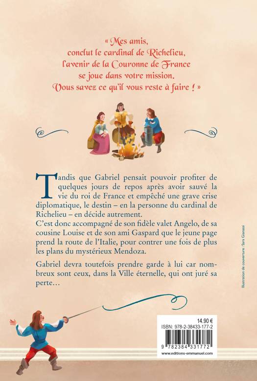 Ayant résolu avec succès l'affaire du vol qui a failli empêcher le mariage de la sœur du roi et provoquer une grave crise diplomatique, Gabriel est nommé page du roi. À ce titre, il est envoyé en Italie sur les traces des spadassins de Mendoza, qui fomentent un nouveau coup en secret. Accompagné de son fidèle Angelo et de sa cousine Louise, Gabriel devra à nouveau faire preuve d'ingéniosité pour mettre son épée au service du roi ! Les lecteurs de 10 à 13 ans retrouveront avec joie ce héros courageux et impétueux et l'extraordinaire plume de Marie Bertier !