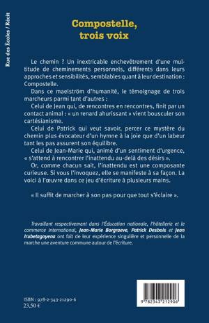 Le chemin ? Un inextricable enchevêtrement d'une multitude de cheminements personnels, différents dans leurs approches et sensibilités, semblables quant à leur destination : Compostelle. Dans ce maelström d'humanité, le témoignage de trois marcheurs parmi tant d'autres : celui de Jean celui de Patrick et celui de Jean-Marie qui, animé d'un sentiment d'urgence, « s'attend à rencontrer l'inattendu au-delà de ses désirs ». Or, comme chacun sait, l'inattendu est une composante curieuse. Si vous l'invoquez, elle se manifeste à sa façon. La voici à l'oeuvre dans ce jeu d'écriture à plusieurs mains.
