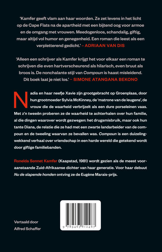 'Alleen een schrijver als Kamfer krijgt het voor elkaar een roman te schrijven die even hartverscheurend als hilarisch, even bruut als broos is. De nonchalante stijl van Compoun is haast misleidend. Dit boek laat je niet los.' – Simone Atangana Bekono