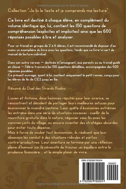 Résumé du Duel des Grands Radins Lucien et Antoine, deux hommes réputés pour leur avarice, se rencontrent et décident de partager leurs meilleures astuces pour économiser le moindre centime. Leur quête d’économies extrêmes les entraîne dans une série de situations cocasses : cueillir de la nourriture gratuite dans la nature, négocier sans fin avec les commerçants du village, ou encore inventer des stratégies absurdes pour éviter toute dépense. Mais à force de vouloir tout économiser, ils réalisent que leur obsession les conduit à des situations ridicules et parfois contre-productives. Leur aventure se termine par une réflexion pleine d’humour sur la nécessité de trouver un équilibre entre la prudence financière… et le simple plaisir de vivre.
