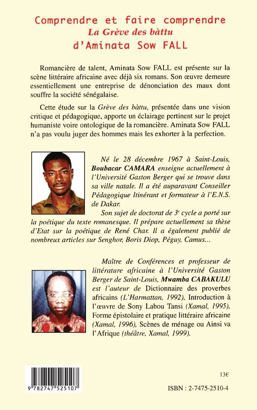Romancière de talent, Aminata Sow Fall est présente sur la scène littéraire africaine avec déjà six romans. Son œuvre demeure essentiellement une entreprise de dénonciation des maux dont souffre la société sénégalaise. Cette étude sur la Grève des bàttu, présentée dans une vision critique et pédagogique, apporte un éclairage pertinent sur le projet humaniste de la romancière.