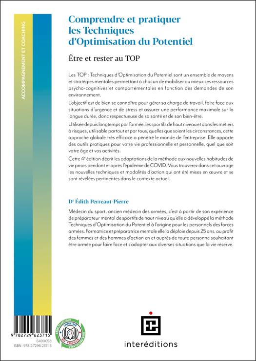 L'ouvrage présente une démarche inédite créée par un médecin et psychologue français et rodée depuis des années. Les TOP : Techniques d'Optimisation du potentiel sont un ensemble de moyens et stratégies mentales permettant à chacun de mobiliser au mieux ses ressources psycho-cognitives et comportementales - bref la tête, le coeur et les jambes! L'objectif est de bien se connaître pour gérer sa charge de travail, faire face aux situations d'urgence et de stress et assurer une performance maximale sur la longue durée, donc respectueuse de sa santé et de son bien-être. Initialement développée à la demande de l'armée, où elle est toujours très utilisée, cette approche globale très efficace a pénétré le monde de l'entreprise et du développement personnel. Cette nouvelle édition intègre les dernières techniques mises au point, affine la compréhension des techniques historiques et prend en compte les évolutions de terminologie.