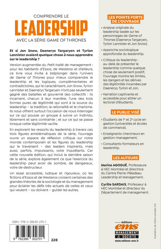 Version augmentée du Petit traité de management : pour les habitants d’Essos, de Westeros et d’ailleurs, ce livre vous invite à (re)plonger dans l’univers de Game of Thrones pour mieux comprendre le leadership et les logiques, complémentaires et contradictoires, qui le caractérisent. Jon Snow, Tyrion Lannister et Daenerys Targaryen n’ont pas seulement gagné des batailles et gouverné des collectifs : ils incarnent, chacun à leur manière, l’une des trois formes pures de légitimité qui sont à la source du leadership – la tradition, la rationalité et le charisme. Ils nous offrent surtout l’occasion de nous interroger sur ce qui pousse un groupe à suivre un individu, librement et sans contrainte ; et sur ce qui se passe lorsque cette légitimité vacille.