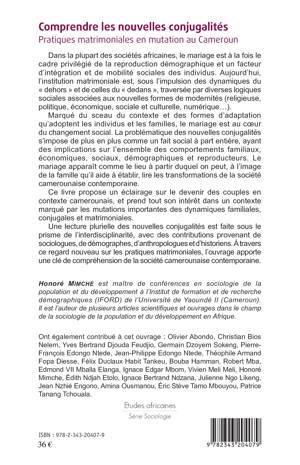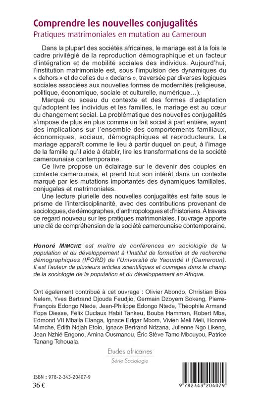 Marqué du sceau du contexte et des formes d'adaptation qu'adoptent les individus et les familles, le mariage est au coeur du changement social. La problématique des nouvelles conjugalités s'impose de plus en plus comme un fait social à part entière, ayant des implications sur l'ensemble des comportements familiaux, économiques, sociaux, démographiques et reproducteurs. Le mariage apparaît comme le lieu à partir duquel on peut, à l'image de la famille qu'il aide à établir, lire les transformations de la société camerounaise contemporaine. Ce livre propose un éclairage sur le devenir des couples en contexte camerounais et prend tout son intérêt dans un contexte marqué par les mutations importantes des dynamiques familiales, conjugales et matrimoniales.