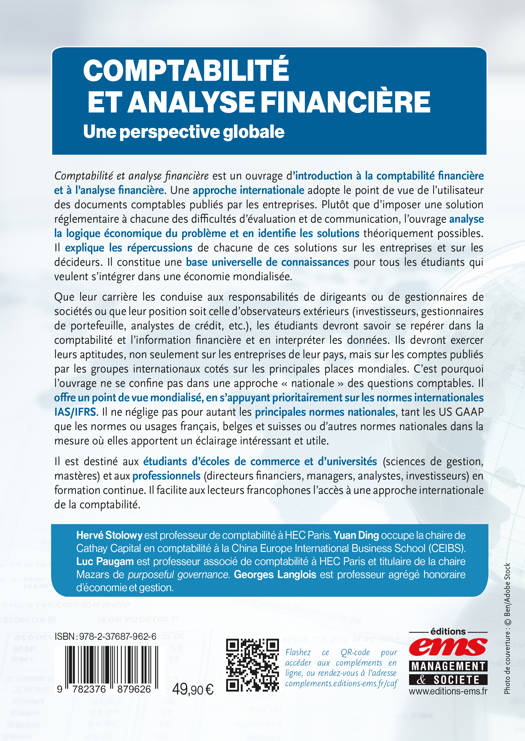 Que leur carrière les conduise aux responsabilités de dirigeants ou de gestionnaires de sociétés ou que leur position soit celle d’observateurs extérieurs (investisseurs, gestionnaires de portefeuille, analystes de crédit, etc.), les étudiants devront savoir se repérer dans la comptabilité et l’information financière et en interpréter les données. Ils devront exercer leurs aptitudes, non seulement sur les entreprises de leur pays, mais sur les comptes publiés par les groupes internationaux cotés sur les principales places mondiales. C’est pourquoi l’ouvrage ne se confine pas dans une approche « nationale » des questions comptables. Il offre un point de vue mondialisé, en s’appuyant prioritairement sur les normes internationales IAS/IFRS. Il ne néglige pas pour autant les principales normes nationales, tant les US GAAP que les normes ou usages français, belges et suisses ou d’autres normes nationales dans la mesure où elles apportent un éclairage intéressant et utile.