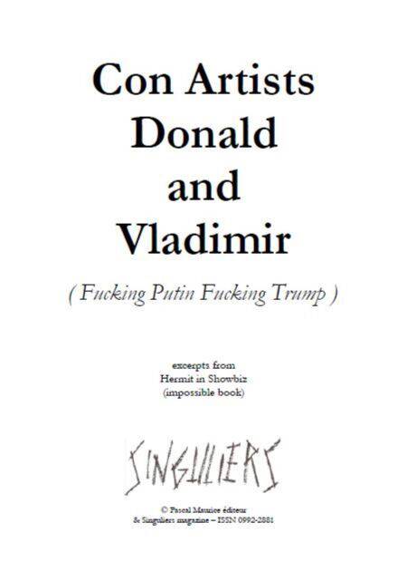 Saints Donald and Vladimir are celebrated on July 15 : this cruel pamphlet honors them in its own way, written by a European explaining why he despises Trump as much as Putin, waste that will end up in the dustbin of history just like the plantigrades that resemble them... Contents : Martha Washington Melchior, Middle West (Immersions), Scammers (Shit Friends), Money not Luxury (Vulgarity Cult), Devil bless America and Russia, Wartime & Business (Mafia Oligarchy), Sexes and Genders, White House & Kremlin Crazies (Idiocraty is Power), Loving Europe (Resistances).
