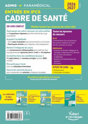 Ce livre Tout-en-un, Concours Cadre de santé, permet de préparer le concours d'entrée en IFCS et de réussir les épreuves écrite et orale :