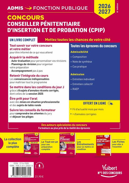 Ce livre tout-en-un propose une préparation complète aux épreuves d'admissibilité et d'admission des concours externe et interne du CPIP.