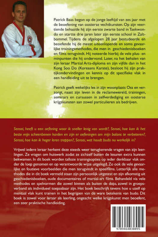 Sensei, heeft u een oefening waar ik sneller lenig van wordt?, Sensei, hoe kan ik het beste mijn scheenbenen harden en zijn er oefeningen om mijn balans te verbeteren?, Sensei, hoe kan ik hoger leren trappen?, Sensei, wat houdt budo nu werkelijk in? Vrijwel iedere leraar herkent deze steeds weer terugkerende vragen van zijn leerlingen. Ze vragen om huiswerk zodat ze zichzelf buiten de lesuren extra kunnen bekwamen. In dit boek worden talloze trainingsopties op ieder denkbaar vlak onder de loep genomen en op verantwoorde wijze uitgelegd. Zo ook de vele gevaarlijke en foutieve voorbeelden die men terugvindt in speelfims. Letterlijk alle methodes die in dit boek vermeld staan zijn persoonlijk uitgetest en zijn afkomstig uit geschiedenisboeken, oude documentaires of martial-art films. Behandeld via vele methodes en spelvormen die zowel binnen als buiten de dojo, zowel in groepsverband als individueel toepasbaar zijn. Het boek beschrijft tevens hoe u uzelf op mentaal vlak kunt trainen in het begrijpen van de ware betekenis van budo. Dit boek is zowel voor leraar als leerling, ongeacht welke krijgskunst men beoefent, een zeer praktische handleiding.