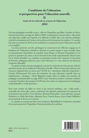 L'ère des pédagogies nouvelles s'ouvre : telle est l'hypothèse que Blais, Gauchet et Ottavi, émettent dans leurs ouvrages de 2002 et 2008. La perspective n'est pas mince : elle mérite une approche outillée qui réponde à la réflexion actuelle, dans son contexte politique, celui de la refondation de l'école et de la réforme de la formation des maîtres. Ce numéro fait suite au numéro de 2012 sur les conditions et perspectives pour l'éducation nouvelle et le complète.