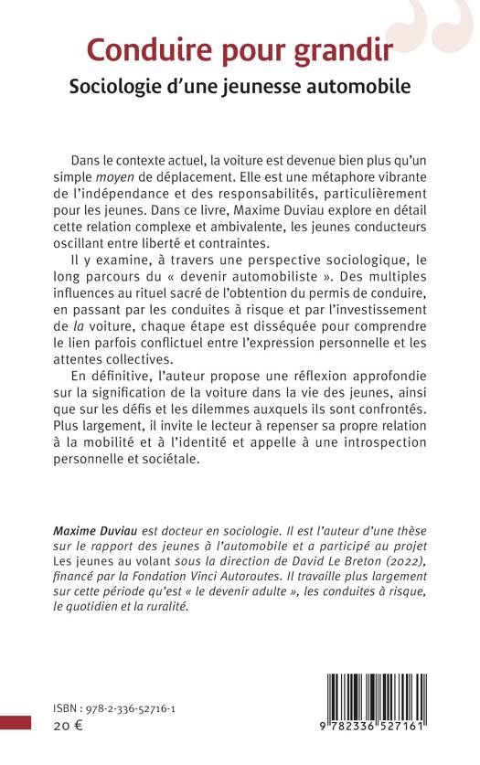 Dans le contexte actuel, la voiture est devenue bien plus qu'un simple moyen de déplacement. Elle est une métaphore vibrante de l'indépendance et des responsabilités, particulièrement pour les jeunes. Dans ce livre, Maxime Duviau explore en détail cette relation complexe et ambivalente, les jeunes conducteurs oscillant entre liberté et contraintes. Il y examine, à travers une perspective sociologique, le long parcours du devenir automobiliste . Des multiples influences au rituel sacré de l'obtention du permis de conduire, en passant par les conduites à risque et par l'investissement de la voiture, chaque étape est disséquée pour comprendre le lien parfois conflictuel entre l'expression personnelle et les attentes collectives. En définitive, l'auteur propose une réflexion approfondie sur la signification de la voiture dans la vie des jeunes, ainsi que sur les défis et les dilemmes auxquels ils sont confrontés. Plus largement, il invite le lecteur à repenser sa propre relation à la mobilité et à l'identité et appelle à une introspection personnelle et sociétale.