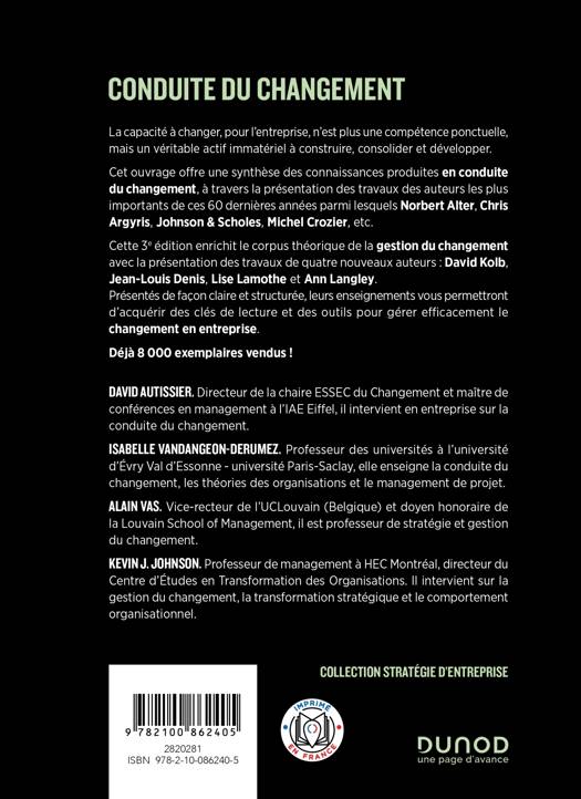 La capacité à changer, pour l’entreprise, n’est plus une compétence ponctuelle, mais un véritable actif immatériel à construire, consolider et développer. Cet ouvrage offre une synthèse des connaissances produites en conduite du changement, à travers la présentation des travaux des auteurs les plus importants de ces 60 dernières années parmi lesquels Norbert Alter, Chris Argyris, Johnson & Scholes, Michel Crozier, etc. Cette 3eédition enrichit le corpus théorique de la gestion du changement avec la présentation des travaux de quartre nouveaux auteurs : David Kolb, Jean-Louis Denis, Lise Lamothe et Ann Langley. Présentés de façon claire et structurée, leurs enseignements vous permettront d’acquérir des clés de lecture et des outils pour gérer efficacement le changement en entreprise. Déjà 8 000 exemplaires vendus !