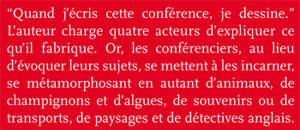 "Quand j'écris cette conférence, je dessine." L'auteur charge quatre acteurs d'expliquer ce qu'il fabrique. Or, les conférenciers, au lieu d'évoquer leurs sujets, se mettent à les incarner, se métamorphosant en autant d'animaux, de champignons et d'algues, de souvenirs ou de transports, de paysages et de détectives anglais.