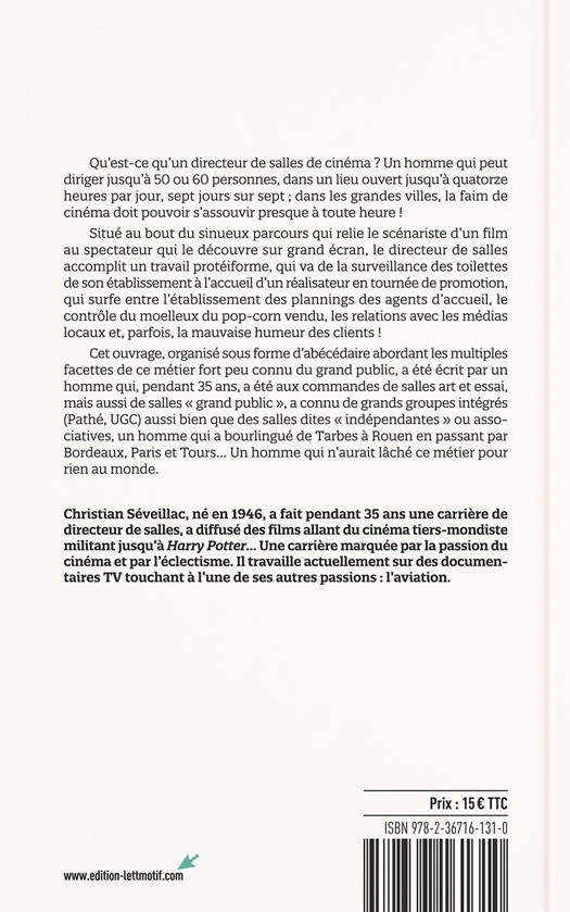 Cet ouvrage, organisé sous forme d’abécédaire abordant les multiples facettes de ce métier fort peu connu du grand public, a été écrit par un homme qui, pendant 35 ans, a été aux commandes de salles art et essai, mais aussi de salles « grand public », a connu de grands groupes intégrés (Pathé, UGC) aussi bien que des salles dites « indépendantes » ou associatives, un homme qui a bourlingué de Tarbes à Rouen en passant par Bordeaux, Paris et Tours… Un homme qui n’aurait lâché ce métier pour rien au monde.