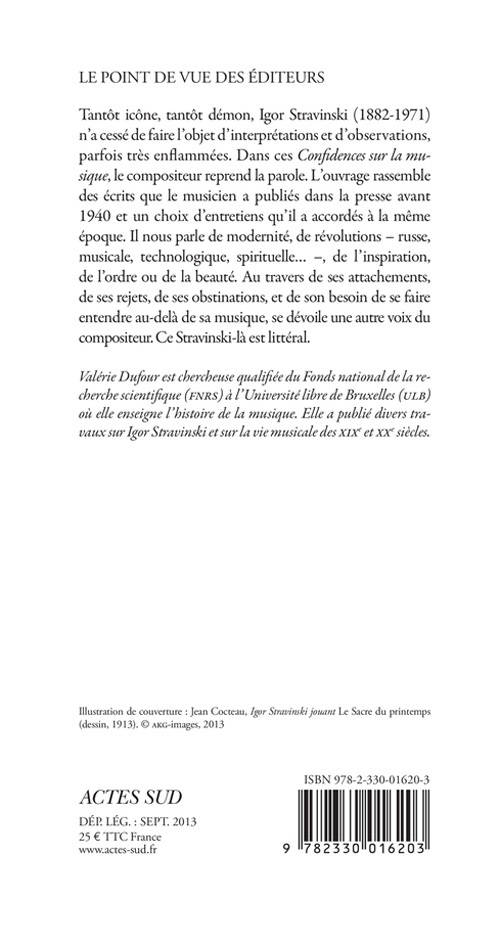 Tantôt icône, tantôt démon, Igor Stravinski (1882-1971) n'a cessé de faire l'objet d'interprétations et d'observations, parfois très enflammées. Dans ces «Confidences sur la musique,» le compositeur reprend la parole. L'ouvrage rassemble des écrits que le musicien a publiés dans la presse avant 1940 et un choix d'entretiens qu'il a accordés à la même époque. Il nous parle de modernité, de révolutions - russe, musicale, technologique, spirituelle... -, de l'inspiration, de l'ordre ou de la beauté. Au travers de ses attachements, de ses rejets, de ses obstinations, et de son besoin de se faire entendre au-delà de sa musique, se dévoile une autre voix du compositeur. Ce Stravinski-là est littéral.